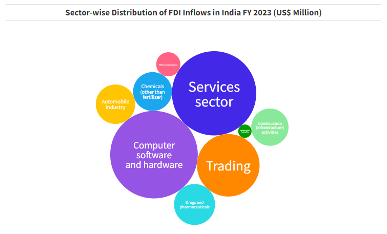 FDI Mapping: The below graph shows the inflow of FDI across several years and the greatest sectors impacted by the FDI are the services and the software and hardware sectors. This reflects a certain trust on the Indian economy and it’s ecosystem.
