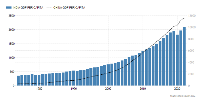 GDP per Capita: There were countries which were on par with us - China, Japan and Korea at some point of time (The Wire shares a good representation of this). China and India had common starting points, however the paths taken map the major areas of differences (Primary and Secondary axis on the chart below).